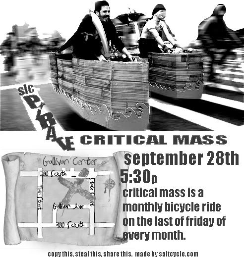 Come be a pirate on a bicycle at the SLC Pirate Critical Mass ride! Whether you dress up as a Pirates of the Captain Jack Sparrow or as Captain Hook, the choice is yours. Whatever you choose, be creative and get ready to plunder the streets.
